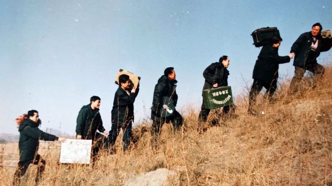 錦州老兵義務電影放映隊成員前往放映電影爬山的路上。(資料照片,1999年11月攝)
