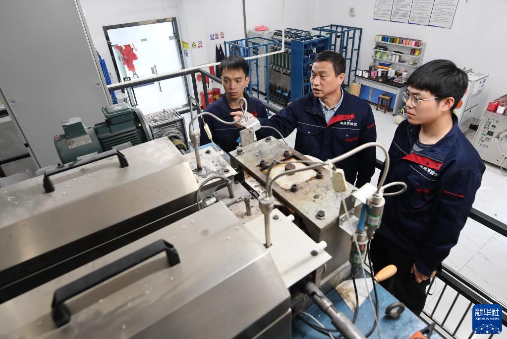 福建閩江學院服裝與藝術工程學院教授李永貴(中)在“福建省新型功能性紡織纖維及材料重點實驗室”教學生做紡絲實驗(2021年3月22日攝)。