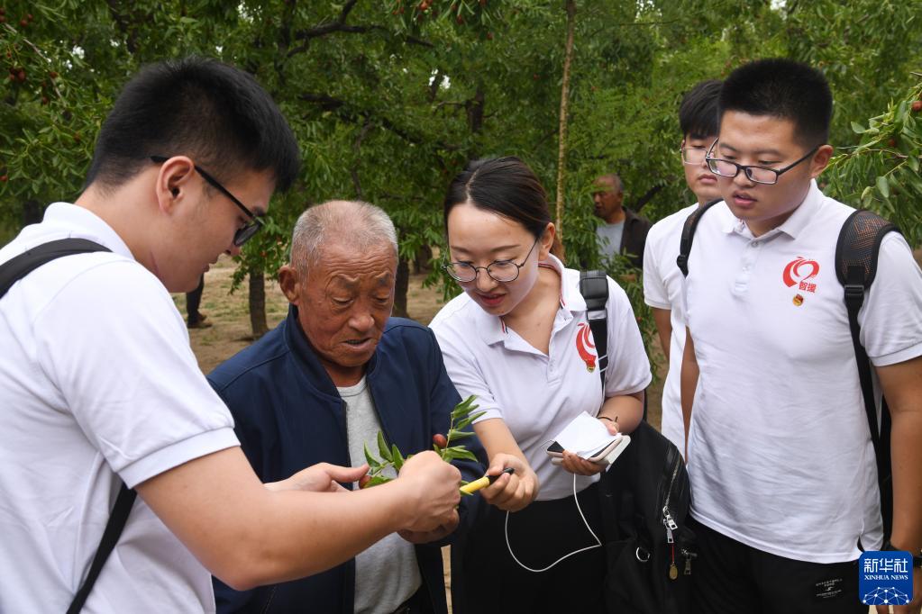 中國海洋大學紅旗智援博士團成員在山東省樂陵市朱集鎮大常村棗林向果農了解果樹種植情況(2019年9月19日攝)。
