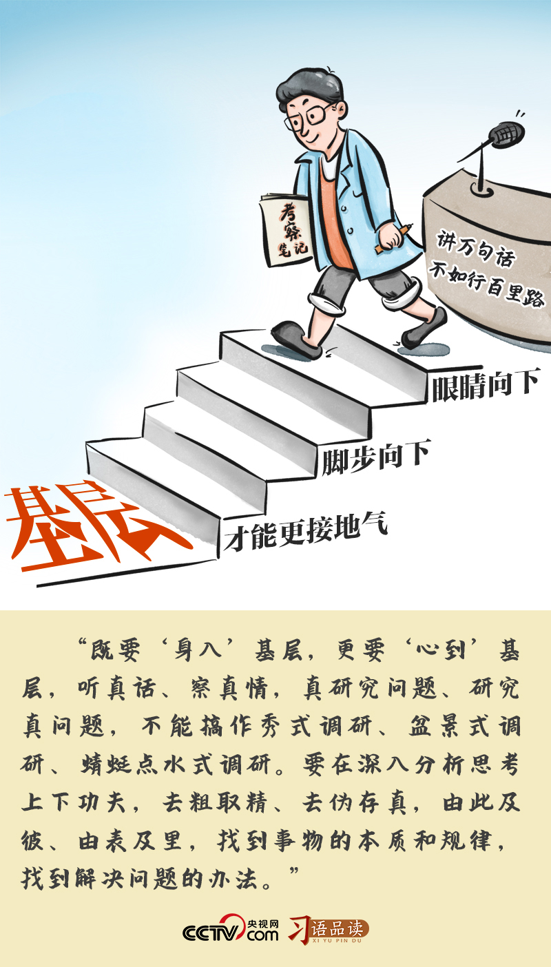 只有深入實踐開展調(diào)查研究,才能搞清楚事情的真相和全貌,去粗取精、去偽存真,把握問題的本質(zhì)和規(guī)律,拿出解決問題的思路和辦法,真正做到“身入”基層,“心到”基層,知行合一。