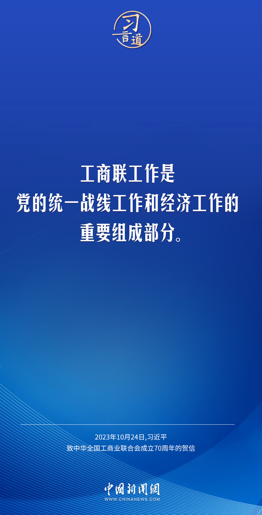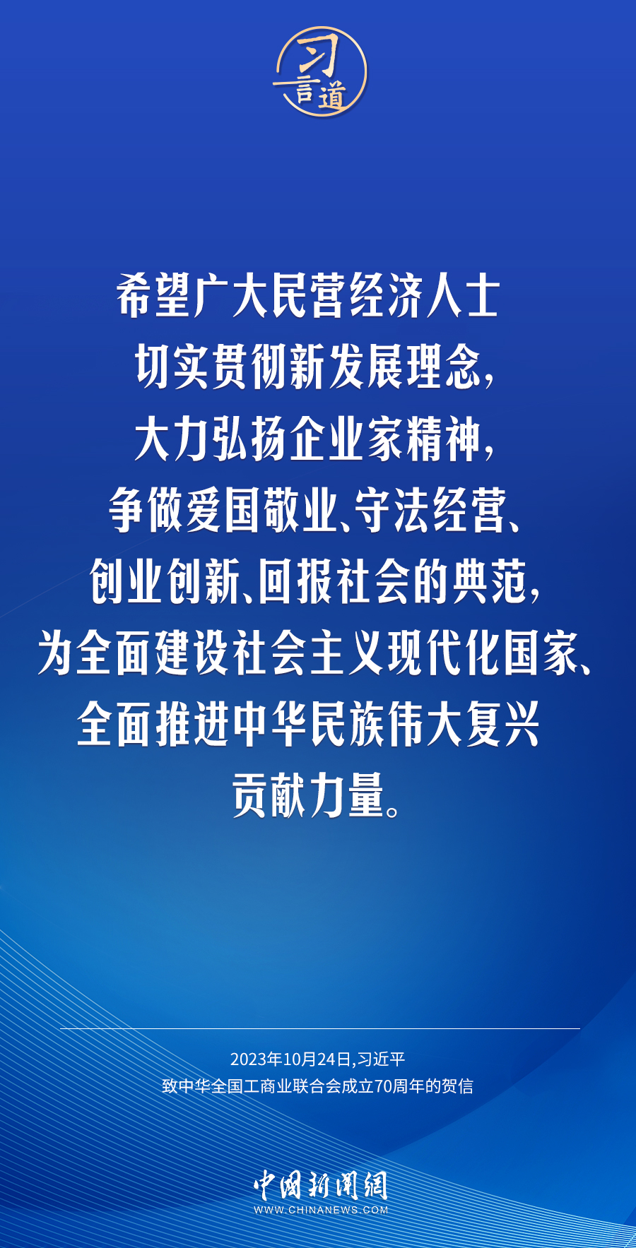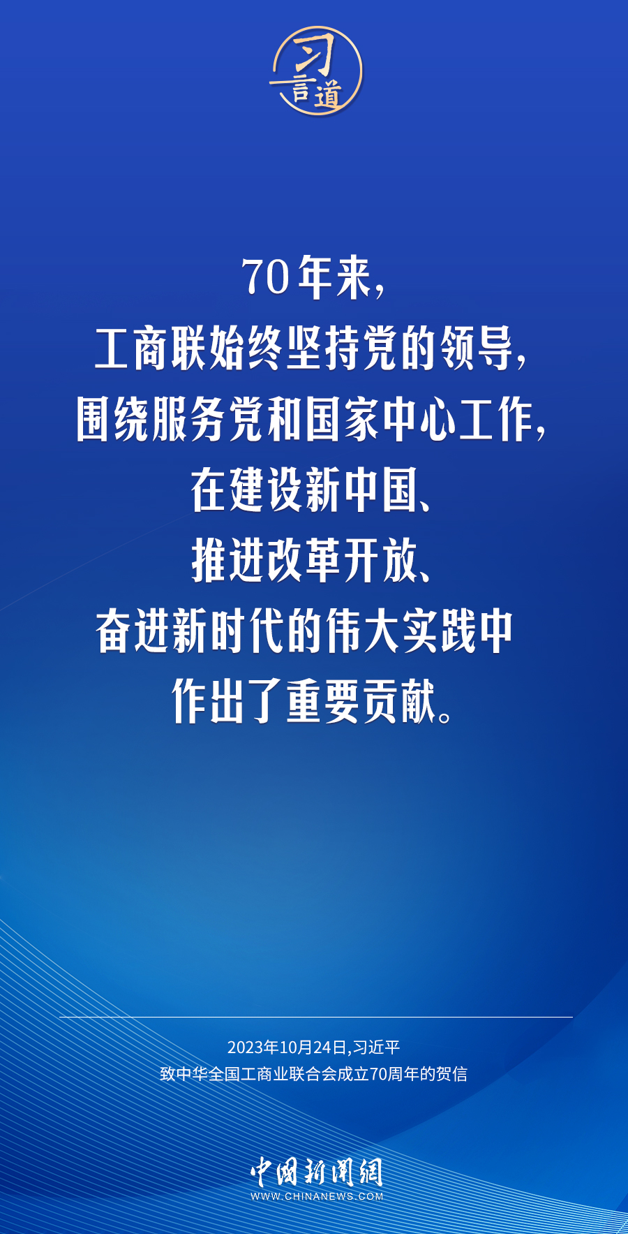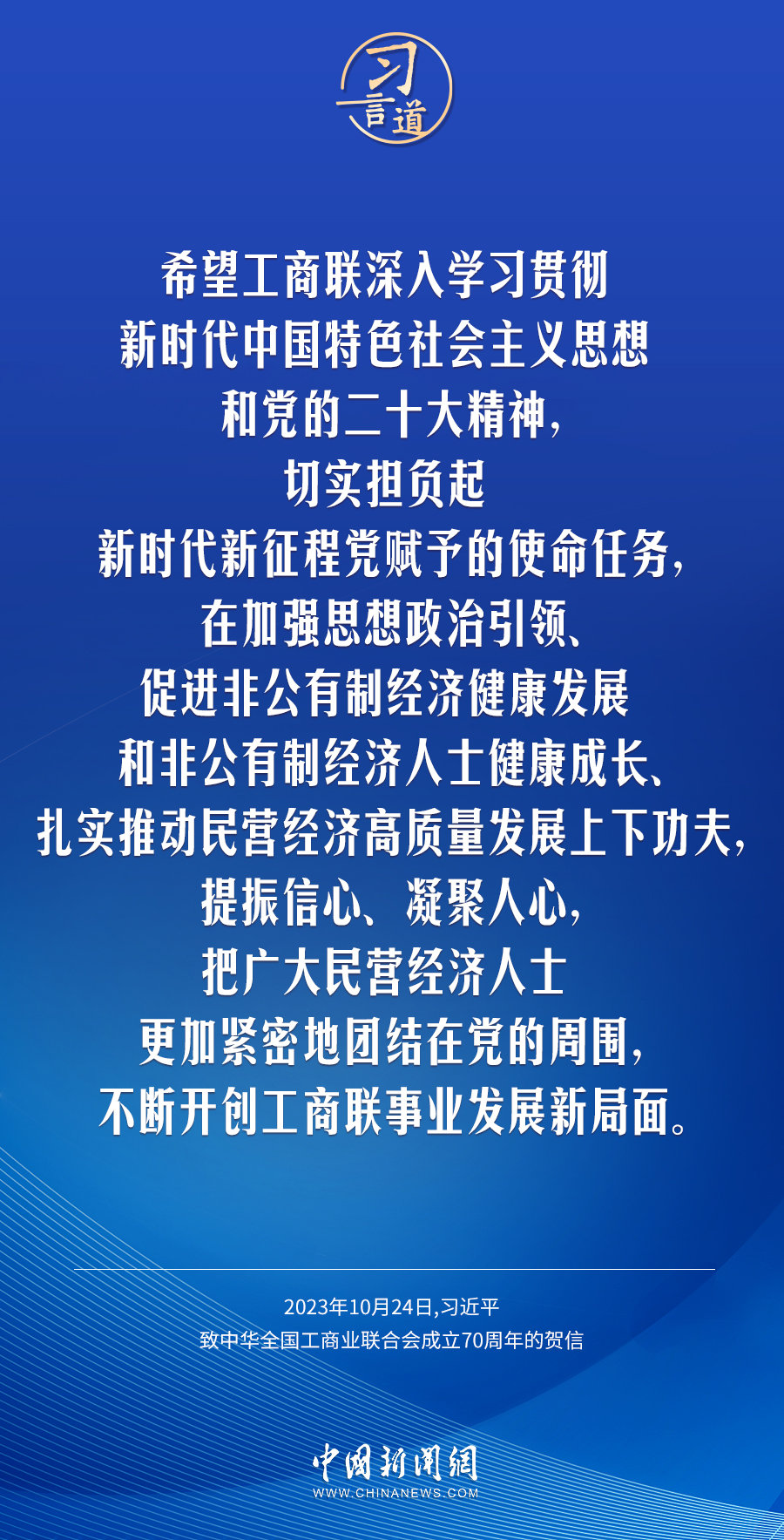 在中華全國工商業聯合會成立70周年之際,中共中央總書記、國家主席、中央軍委主席習近平發來賀信,代表黨中央致以熱烈祝賀,向工商聯系統全體干部職工和全國廣大民營經濟人士致以誠摯問候。