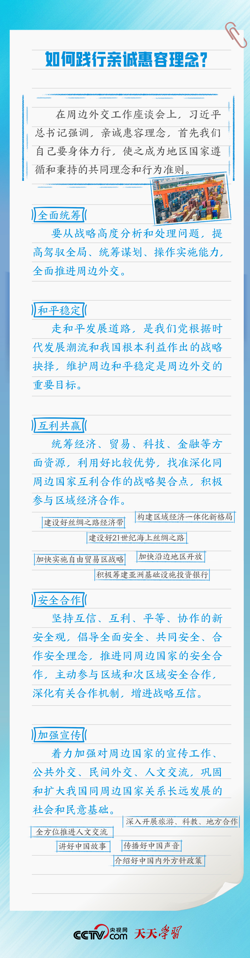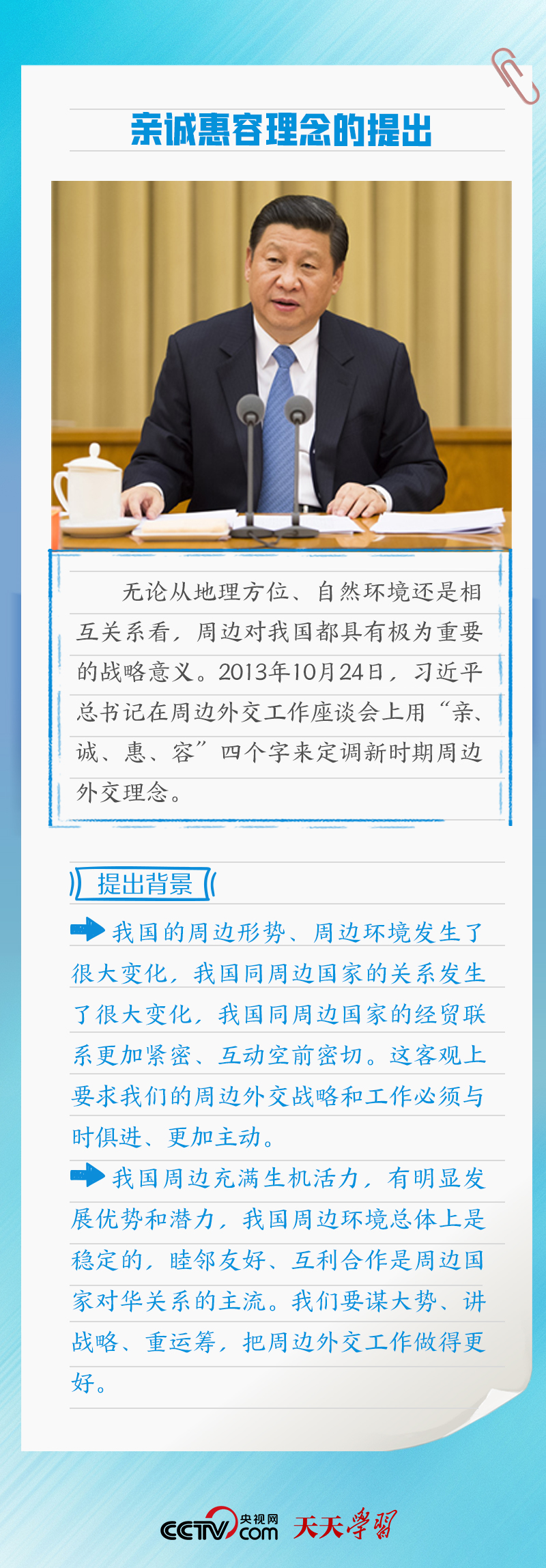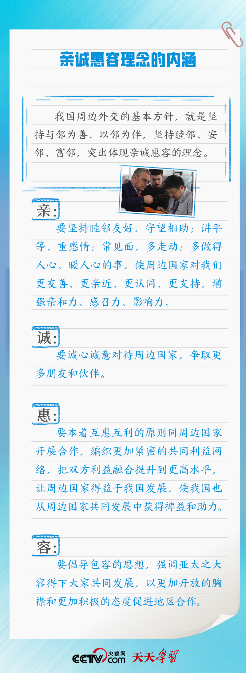 “親誠惠容”理念,源自多年來中國周邊外交實踐,是新形勢下中國堅持走和平發展道路的生動宣言。親誠惠容理念有何重要內涵?如何踐行親誠惠容理念?央視網《天天學習》欄目特梳理相關內容,與您一起學習。