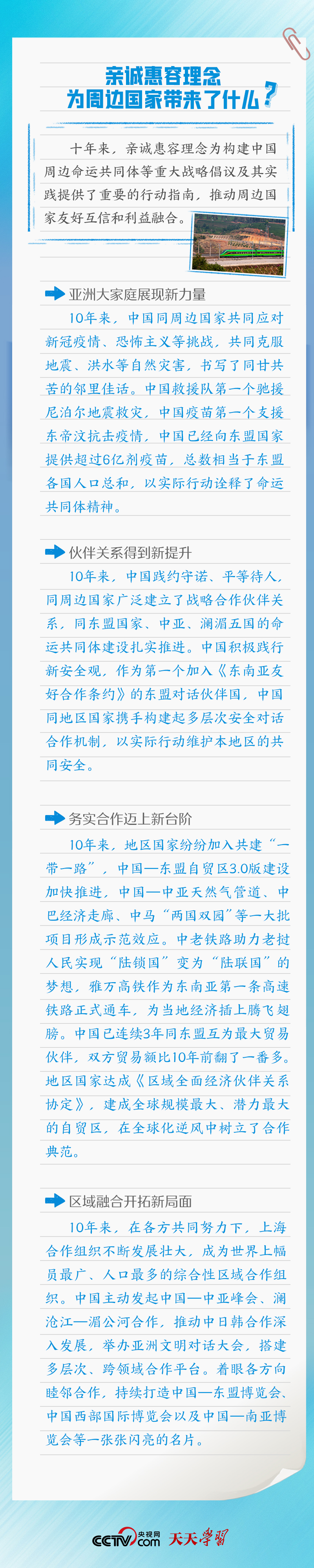 10月24日,習近平主席向紀念親誠惠容周邊外交理念提出10周年國際研討會發表書面致辭指出,10年來,中國積極踐行親誠惠容理念,全面發展同周邊國家的友好合作關系,雙方政治互信不斷增強,利益融合持續深化,走出了一條睦鄰友好、合作共贏的光明大道。