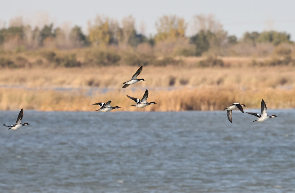 2023年11月12日,在黃河三角洲國家級自然保護區,越冬候鳥在飛翔。
