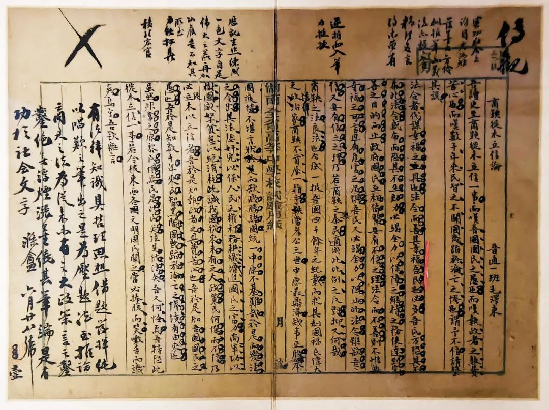 1912年,毛澤東以第一名的成績考入湖南全省高等中學(xué)校(今長沙市第一中學(xué))。不久學(xué)校舉行了一次作文比賽,主題是讀史用史。毛澤東根據(jù)《史記》記載的“商鞅徙木立信”的故事內(nèi)容并聯(lián)系當(dāng)時的社會現(xiàn)狀,揮筆寫下大氣磅礴的《商鞅徙木立信論》,以抒發(fā)胸懷。毛澤東在文中論述了以民為本、取信于民的思想,提出“法令而善,其幸福吾民也必多”,憂國憂民的為民情懷和利國富民的革命理想躍然紙上。老師柳潛閱卷后給了滿分,并批語:“歷觀生作,練成一色文字,自是偉大之器,再加功候,吾不知其所至。”校長符定一看后,特地批注“傳觀”兩個朱紅大字。