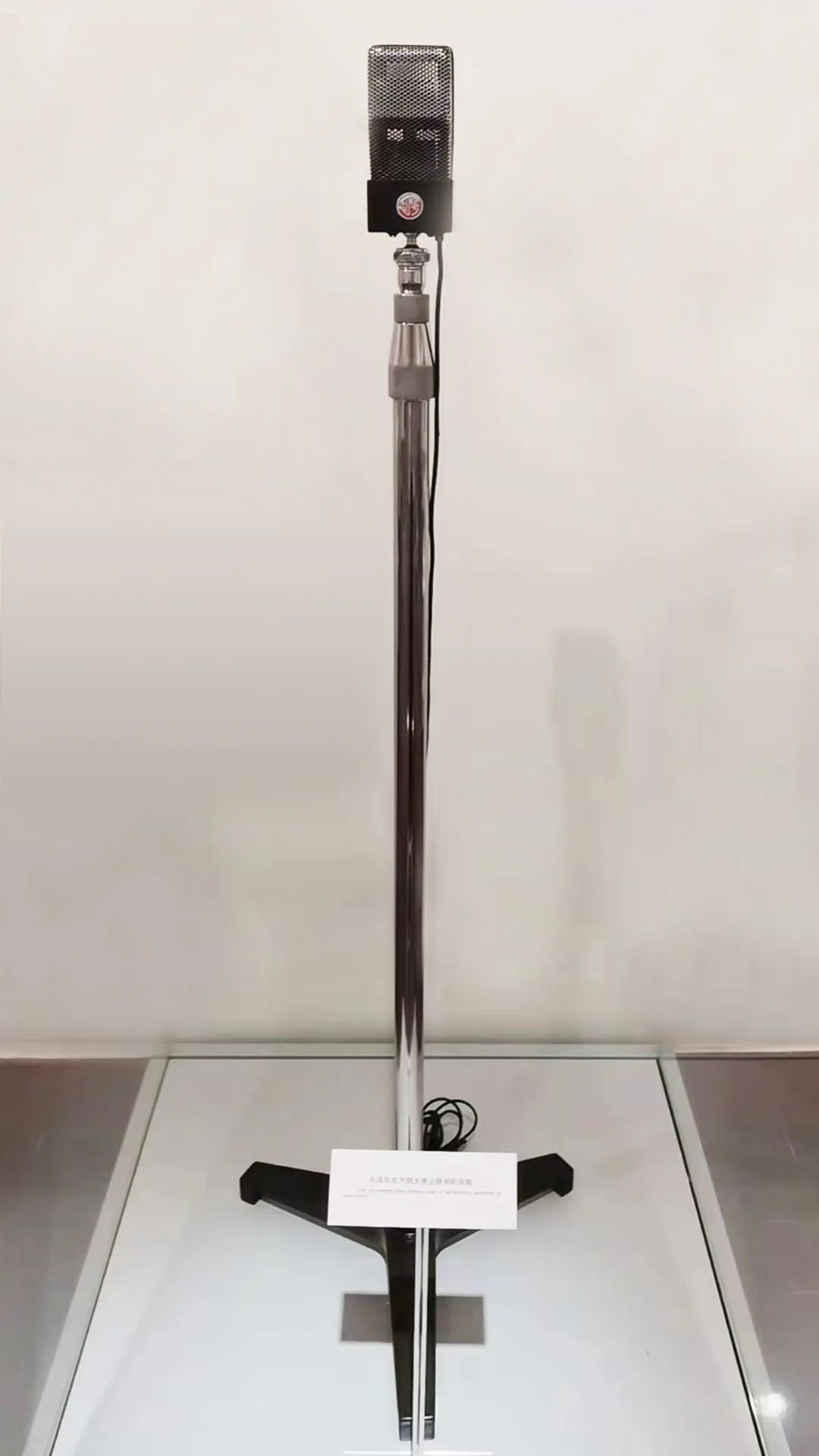 這是一支珍貴的話筒,它底徑長43.5厘米,高134厘米,話筒上鑲嵌著一枚刻有“和平”二字的紅底圓形標(biāo)牌。這是1949年10月1日開國大典時,毛澤東在天安門城樓上向全世界莊嚴(yán)宣告“中華人民共和國中央人民政府成立”時使用的話筒。