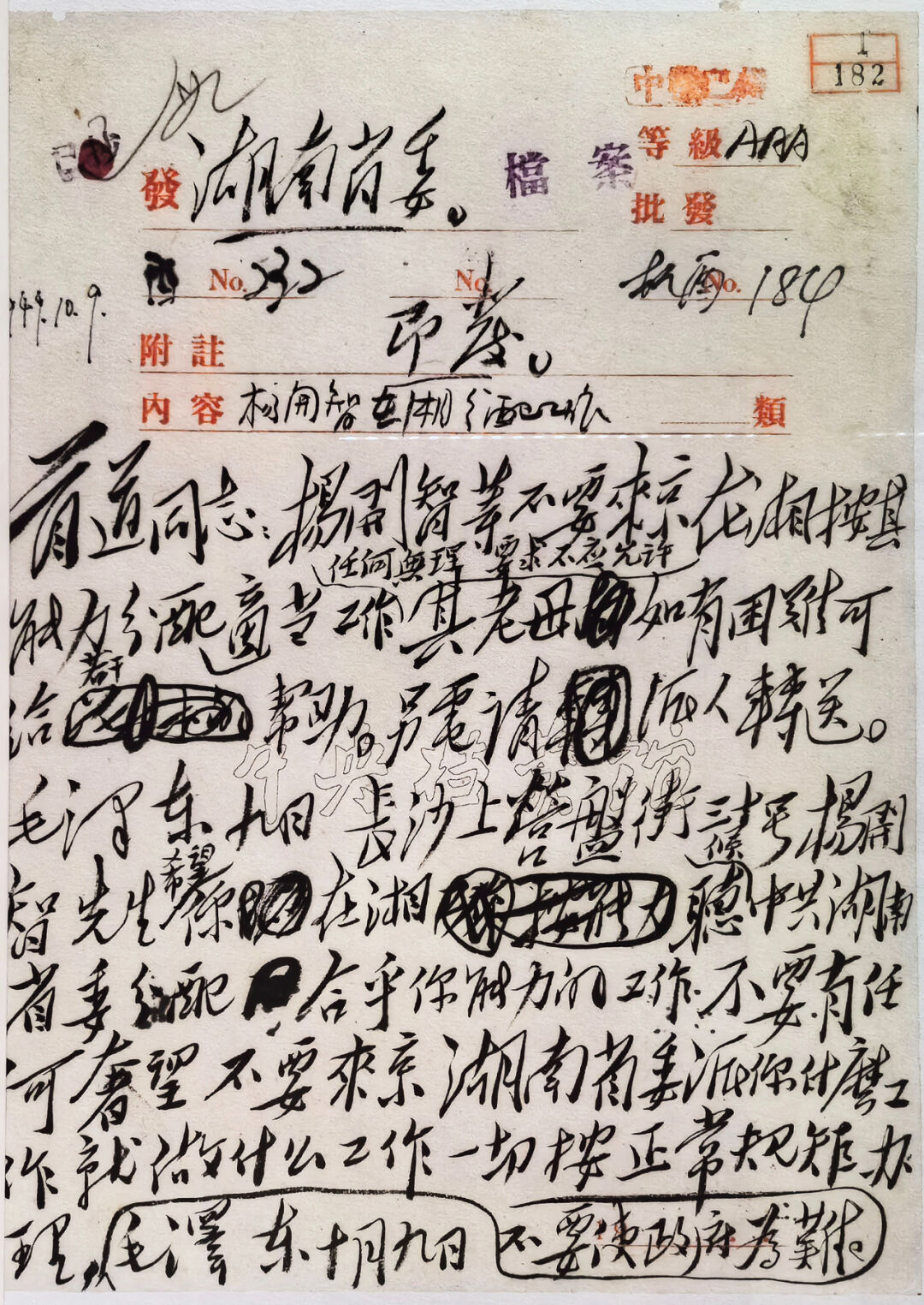 這是一封發(fā)給湖南省委的特殊電報,發(fā)報時間為1949年10月9日,發(fā)報內(nèi)容為“楊開智在湘分配工作”。新中國成立前夕,楊開慧的胞兄楊開智寫信給毛澤東,希望能給他在北京安排一份工作,或是在長沙幫他謀得一個“廳長方面位置”。收到信后,毛澤東并沒有答應(yīng)楊開智的請求,而是發(fā)了這樣一封特殊的電報。電報稿分為兩部分,第一部分是給時任湖南省委第一副書記、長沙市軍管會副主任王首道的,內(nèi)容為:“楊開智等不要來京,在湘按其能力分配適當(dāng)工作,任何無理要求不應(yīng)允許。其老母如有困難,可給若干幫助。”第二部分是希望王首道派人轉(zhuǎn)送給楊開智的,內(nèi)容為:“楊開智先生:希望你在湘聽候中共湖南省委分配合乎你能力的工作,不要有任何奢望,不要來京。湖南省委派你什么工作就做什么工作。一切按正常規(guī)矩辦理,不要使政府為難。”