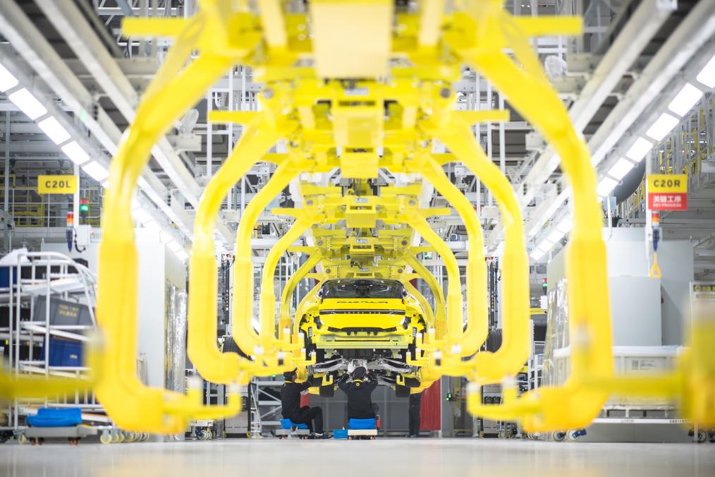 2023年1月11日,在位于湖北省武漢市經(jīng)開(kāi)區(qū)智能網(wǎng)聯(lián)和電動(dòng)汽車(chē)產(chǎn)業(yè)園的路特斯全球智能工廠,工人在流水線上作業(yè)。