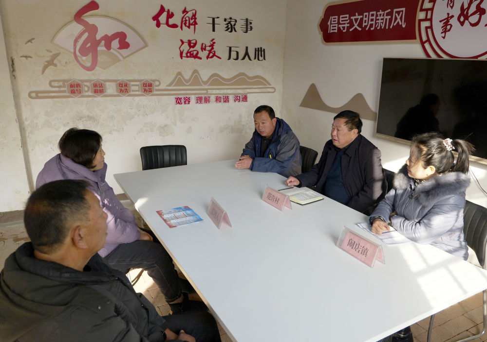 在寶豐縣鬧店鎮范營村“擺理堂”,村鎮干部(右)為村民進行信訪調解(2023年12月20日攝)。河南省寶豐縣積極推進四下基層工作深入開展,已打造鬧店鎮范營村“擺理堂”、石橋鎮東大莊村“老娘舅茶室”等系列鄉村社區服務陣地,協調鄰里關系,有效化解各類矛盾,同時不斷豐富工作內容,拓展服務功能,助力鄉村振興。