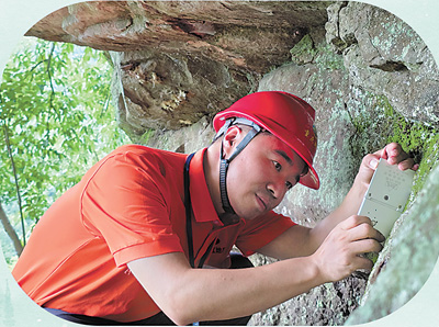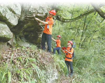 手腳并用地爬了五里的坡,陳昊和同事來到危巖垮塌處。“危巖高約6米,橫寬5米,厚約4米,呈立方體狀,本次垮塌為該危巖頂部突出巖塊……”陳昊單膝跪地,操作著羅盤和卷尺,口中念出測量出的數據,同事飛快地用筆記錄。