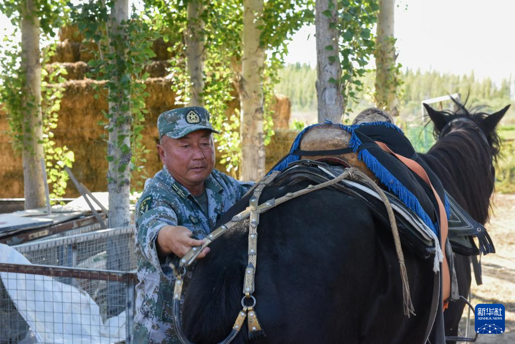 護邊員朱國利給馬套馬鞍,準備巡邊(2024年9月5日攝)。