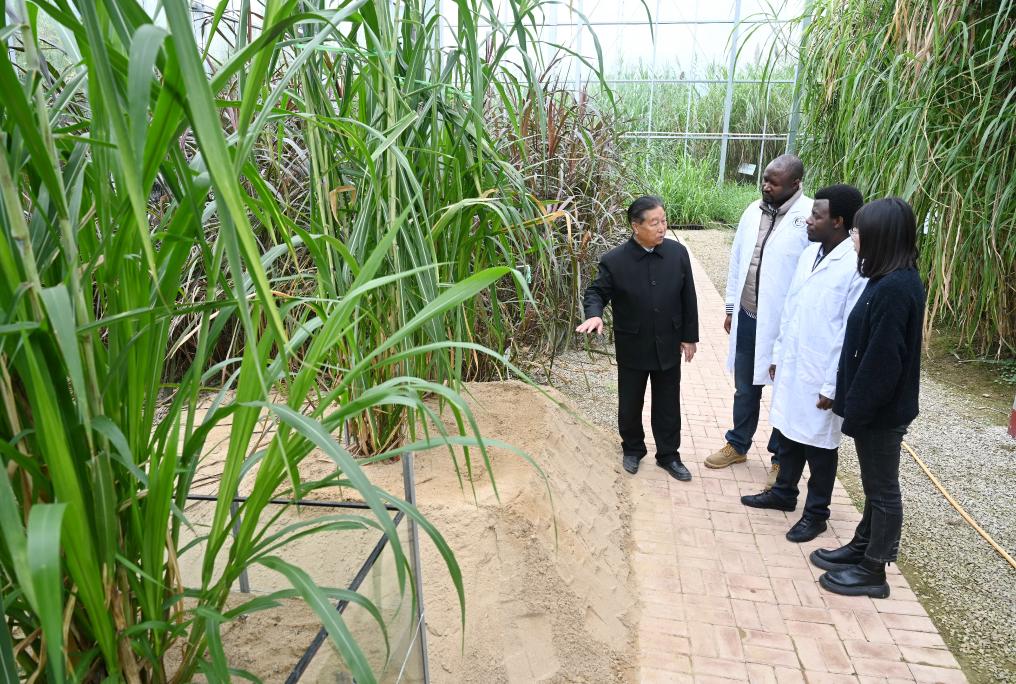 圖為2021年11月23日,林占熺(左一)在國家菌草工程技術研究中心菌草種質資源圃給福建農林大學留學生(左二、左三)講解菌草種植培育技術。