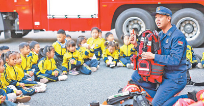 江蘇連云港市連云區(qū)消防救援大隊消防員向小朋友介紹消防裝備。